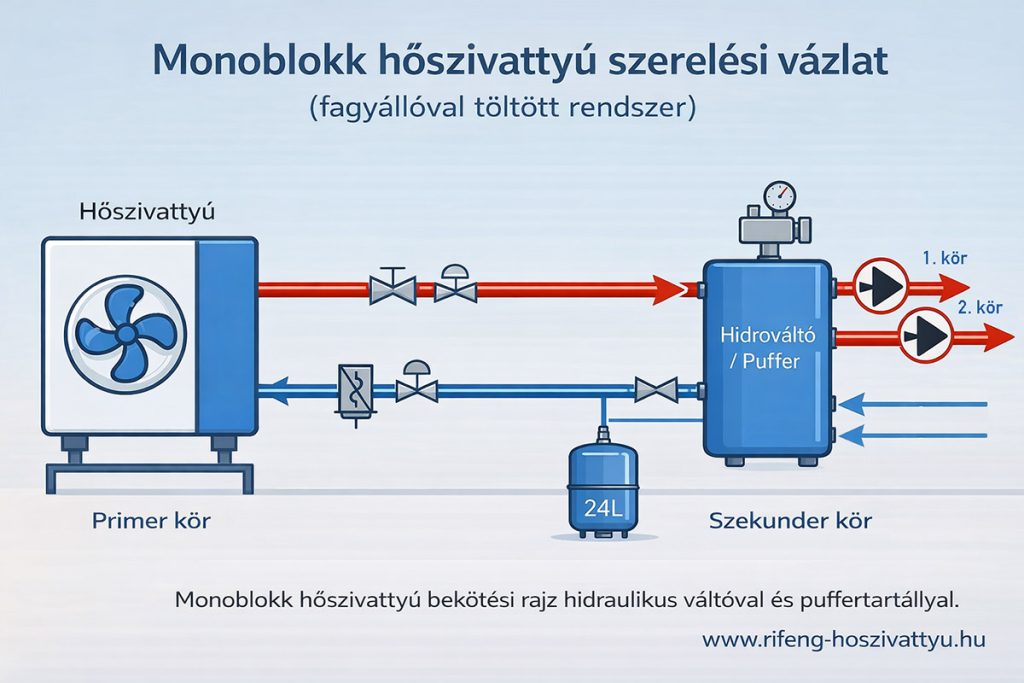 Monoblokkos hőszivattyú és fűtésrendszer, bekötési útmutató